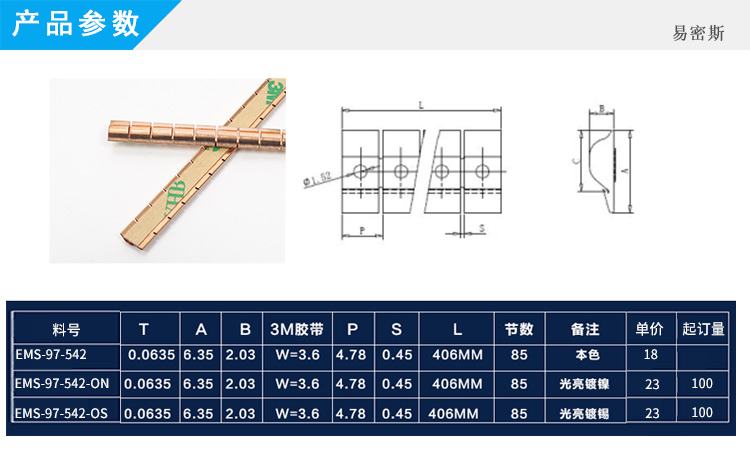 折卷式系列EMS-97-542U型槽鈹銅簧片屏蔽彈片標(biāo)準(zhǔn)簧