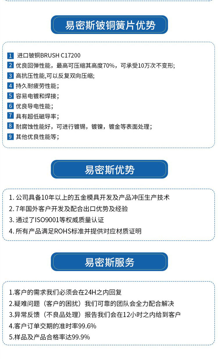 所以,要想選擇好的金屬簧片廠家,還請(qǐng)認(rèn)準(zhǔn)[易密斯]鈹銅簧片,10年以上生產(chǎn)經(jīng)驗(yàn),60%市場(chǎng)占有率,1對(duì)1定制生產(chǎn)方案與及時(shí)的售后服務(wù),讓用戶金屬簧片買的放心,用得稱心。易密斯屏蔽簧片專心專注,只為提升客戶生產(chǎn)工藝。